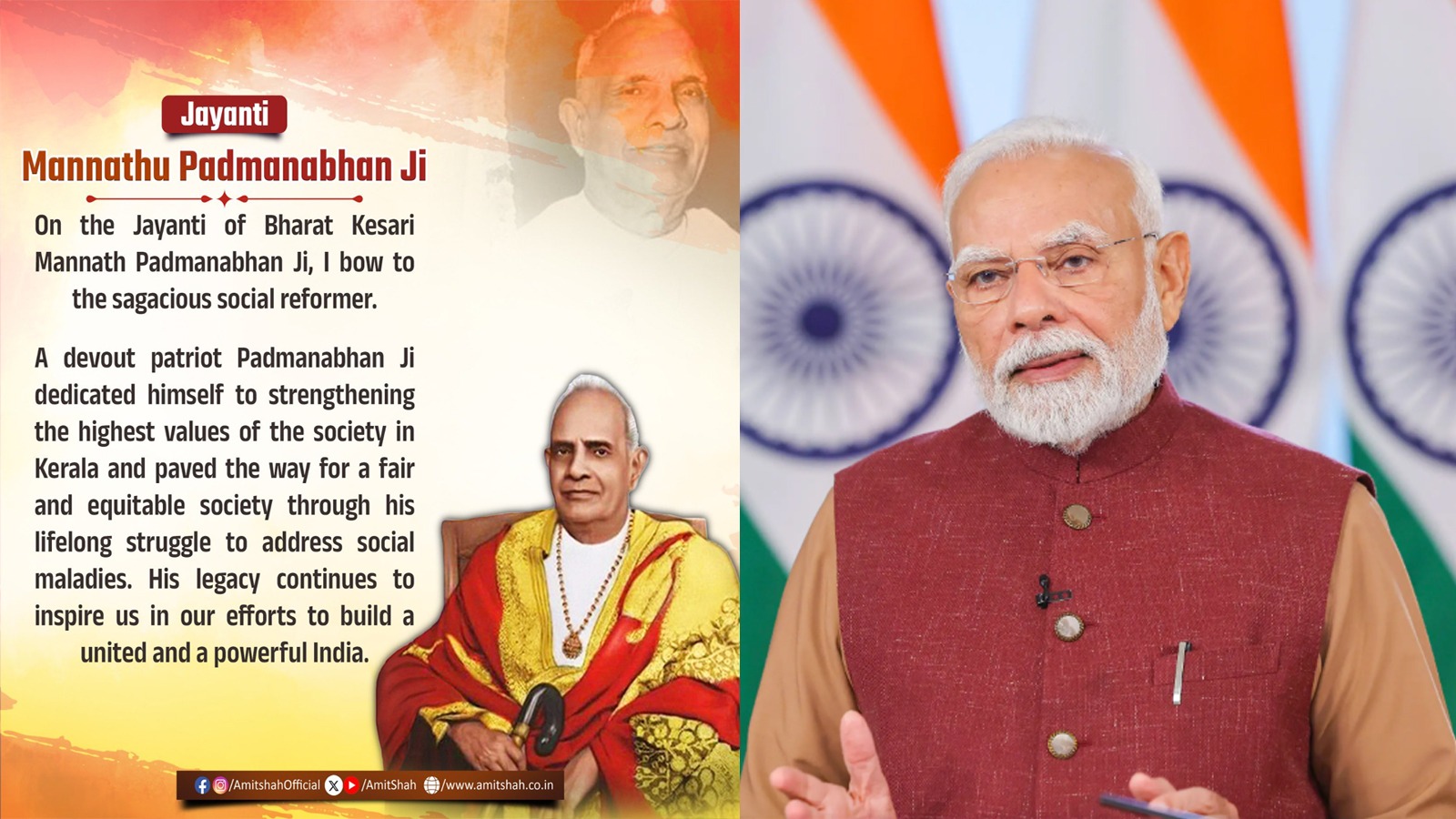 In a message shared on social media platform X, Prime Minister Modi said that Mannathu Padmanabhan was a towering personality whose commitment to serving society went beyond words and reflected in action. He described Padmanabhan as a visionary who firmly believed that true progress could only be achieved through dignity, equality, and meaningful social reform. The Prime Minister also noted that Padmanabhan’s contributions in fields such as health, education, and women empowerment remain deeply motivating even today.